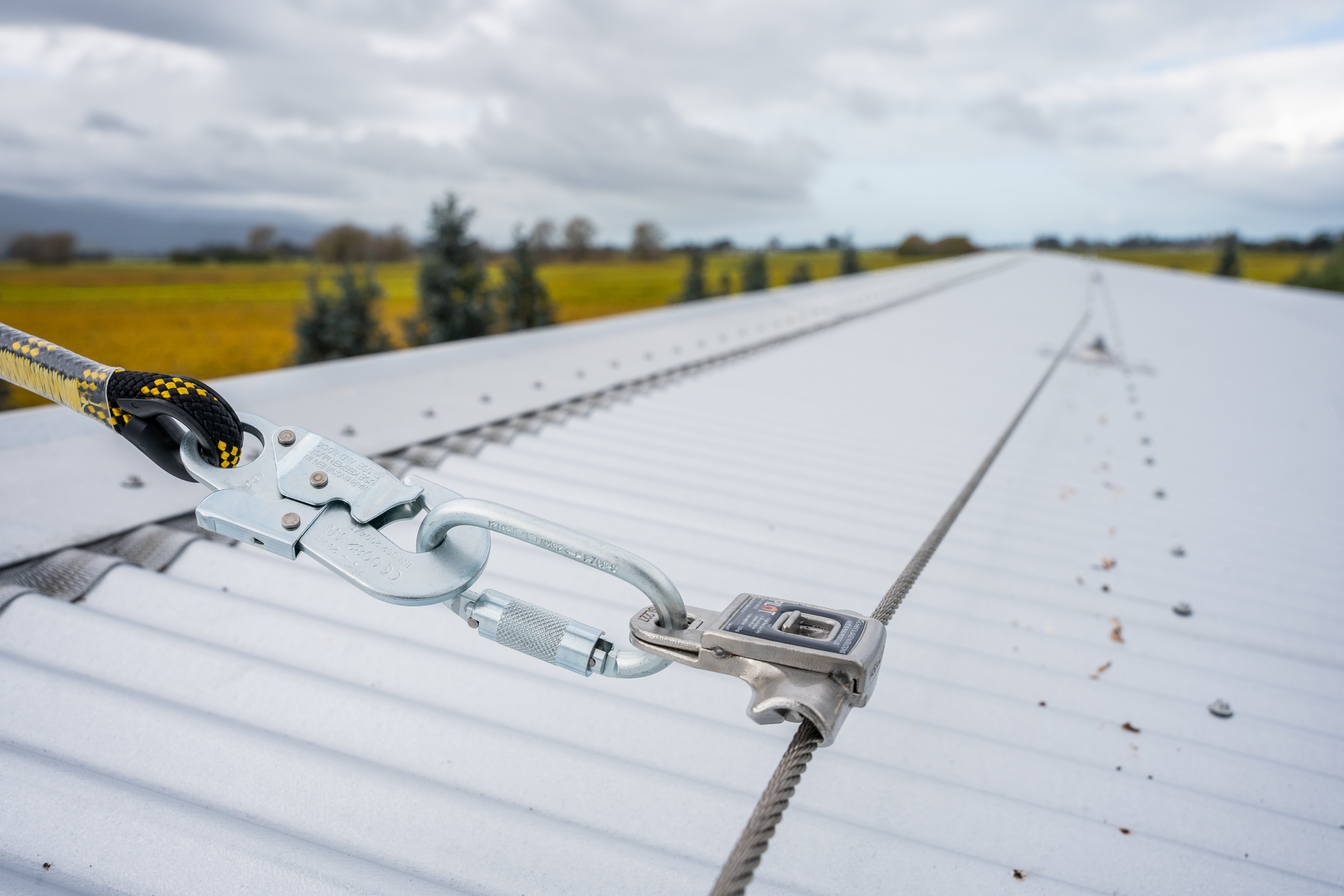 The vertical range of fall arrest systems is an elegant and secure alternative to traditional roof ladders and tower systems. The user, equipped with a harness, is directly connected to the fall arrest cable which is integrated into the access ladder with vertical brackets. The shuttle fitted with an energy absorber follows the user effortlessly and locks instantly in the event of a slip or fall.